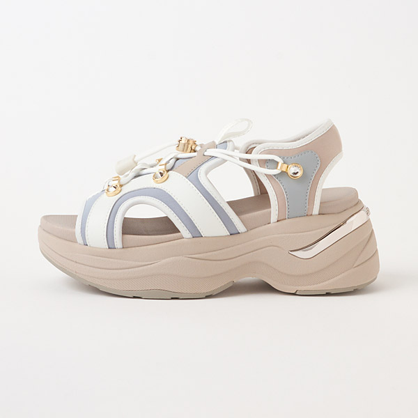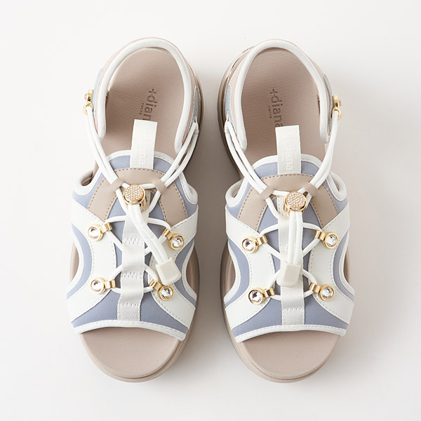 ★每年都广受欢迎的松紧绳凉鞋升级款闪亮登场!新开发的立体鞋床进一步提升穿着舒适度,蓬松弹软的穿着感让人欲罢不能♪卡扣和绳孔上的宝石饰件增添华丽感,鞋跟上的金属饰件又增添了高级感。