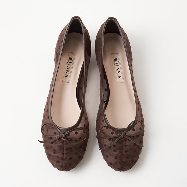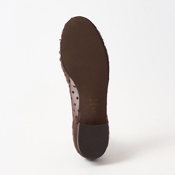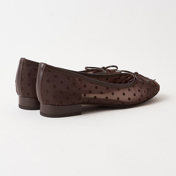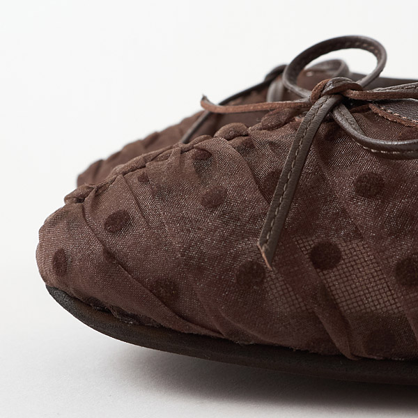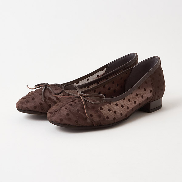 ★鞋尖壓褶為設計亮點,現正流行的芭蕾鞋。使用本季特有透膚玻璃紗面料壓褶,為雙腳增添柔和感與立體感。簡潔俐落的圓頭搭配圓點圖案的成熟可愛設計。