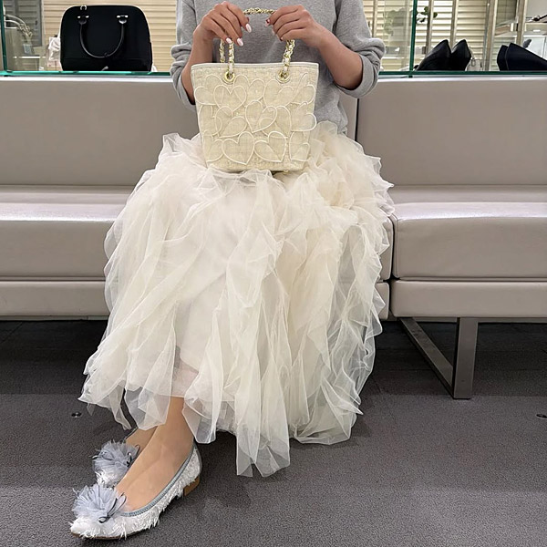 ★使用通透材質的華麗波浪摺邊花飾散發主角級存在感的芭蕾鞋。重疊的薄紗具可愛份量感的鞋款。在波浪摺邊中悄然點綴的蝴蝶結,呈現淑女造型。