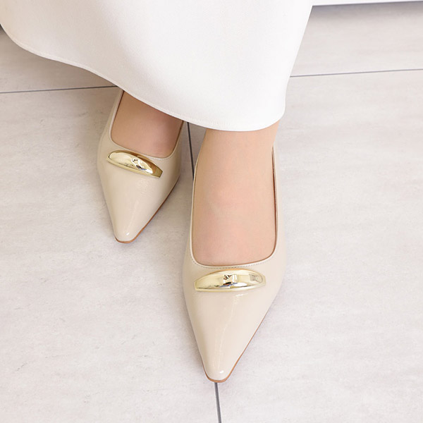 ★金屬配件令人印象深刻的長鼻平底淺口鞋。突出的金屬配件成為時尚點綴,不對稱鞋口為雙腳增添俐落感。從側邊觀看時,鞋跟側向內收的鞋跟輪廓為特色之一。
