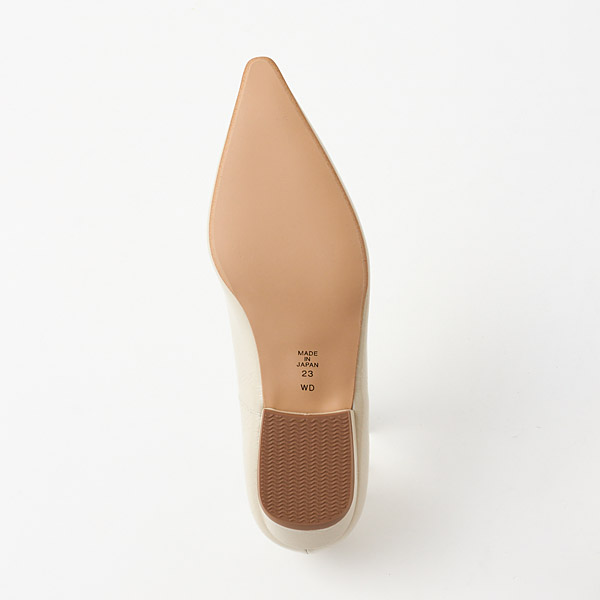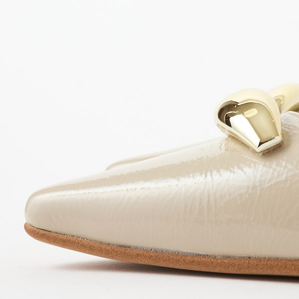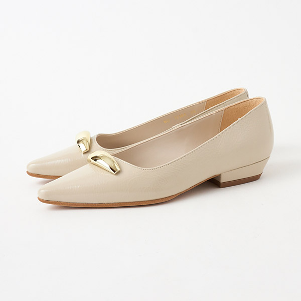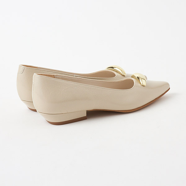 ★金屬配件令人印象深刻的長鼻平底淺口鞋。突出的金屬配件成為時尚點綴,不對稱鞋口為雙腳增添俐落感。從側邊觀看時,鞋跟側向內收的鞋跟輪廓為特色之一。