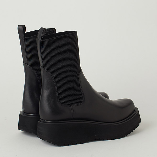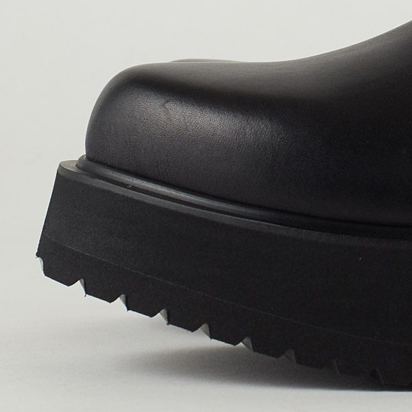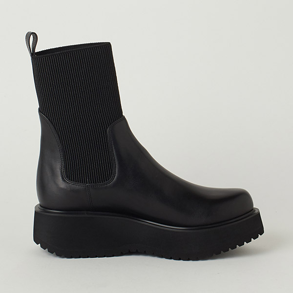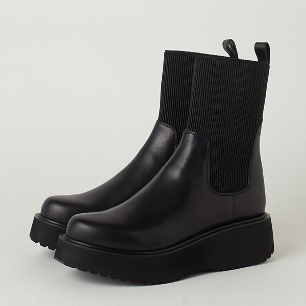 ★區塊輪廓的厚底鞋底,新穎的異材質混搭短靴。看似纖細的腳踝周圍採用具伸縮性的鬆緊材質。厚底鞋底與張弛有度的輪廓,極具魅力。
