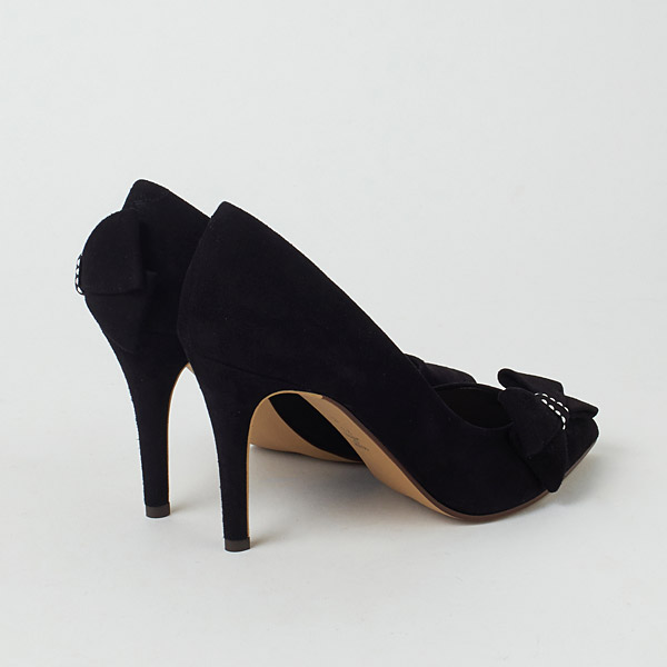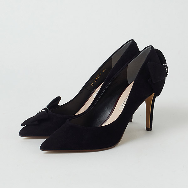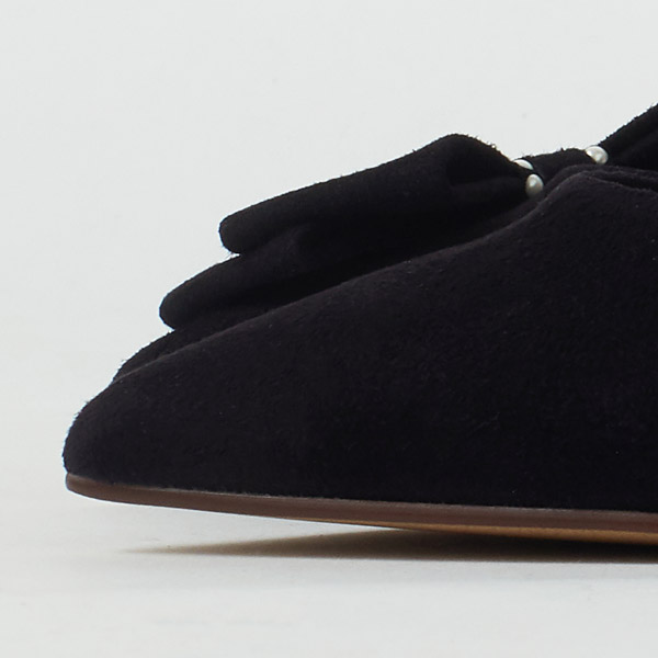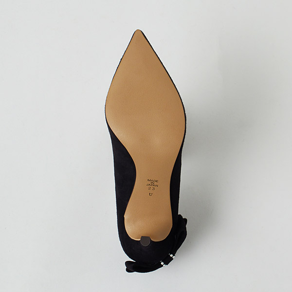 Bow-adorned pumps to make your look gorgeous and feel confident on your special day. The right shoe has a diagonal bow on the side to guide the gaze vertically and add length to your legs below the knee. The left shoe has a voluminous bow on the bottom of the heel counter to contrast the slender heel line and highlight the daintiness of your ankle.