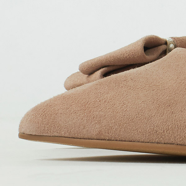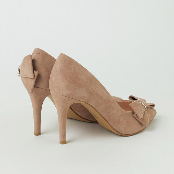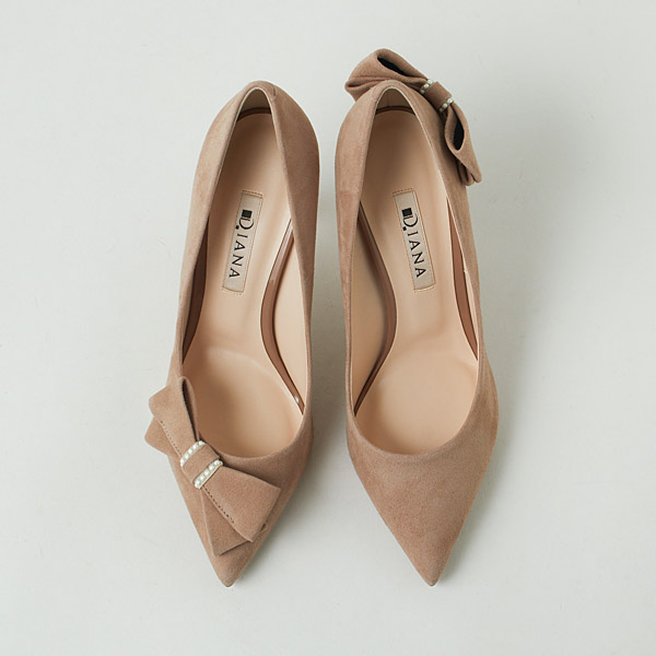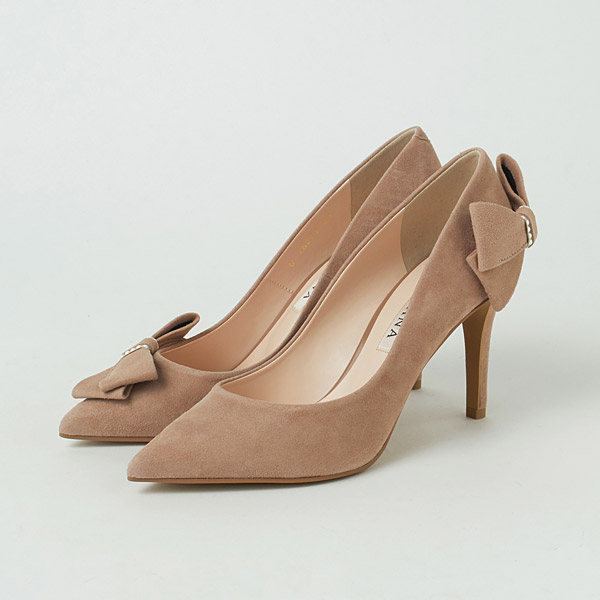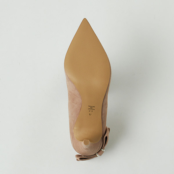 Bow-adorned pumps to make your look gorgeous and feel confident on your special day. The right shoe has a diagonal bow on the side to guide the gaze vertically and add length to your legs below the knee. The left shoe has a voluminous bow on the bottom of the heel counter to contrast the slender heel line and highlight the daintiness of your ankle.