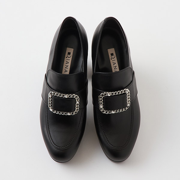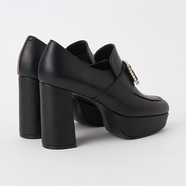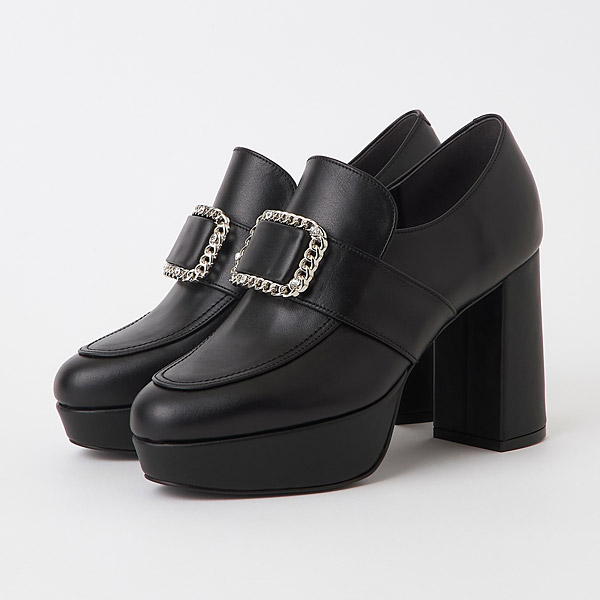 Pumps with a loafer design and added volume at the soles. A key feature is the buckle that is like an accessory with a dainty chain and tiny rhinestones in its loops! The strap is positioned perfectly to create an exquisite line that boosts your style.