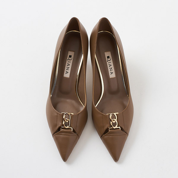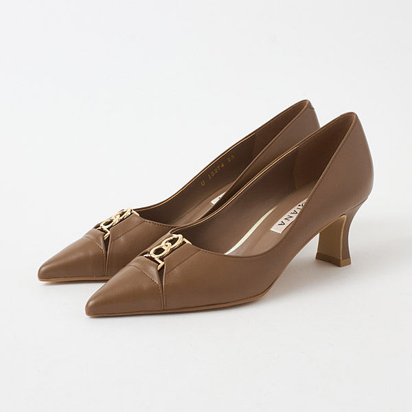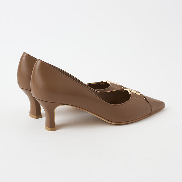 Mid-heel pumps featuring a chain motif accent on the instep. Narrow slits on the sides of the chain hardware create a fresh and new design with airy appeal.