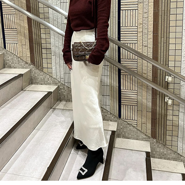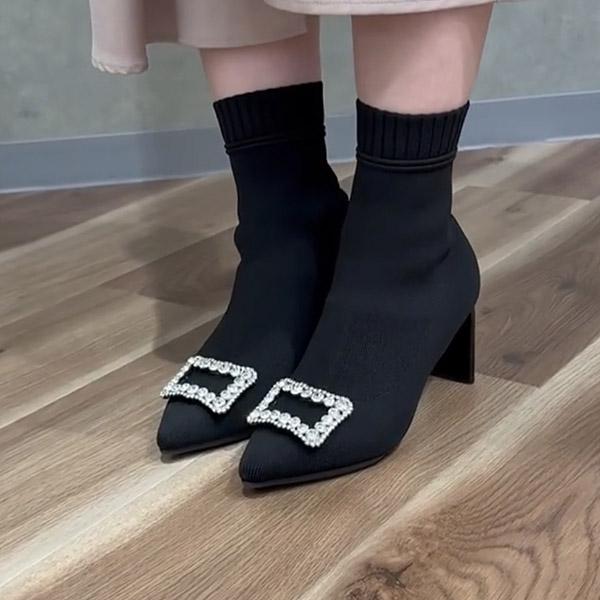 Knit boots featuring a rhinestone-adorned buckle accent. The soles are made of strong supple material with elastic and wear resistant properties. The material is eco-friendly and returns to the earth without further processing. Cushiony and resilient originally-designed cup insoles create soft comfort. The construction is designed to reduce the stress on your feet even after hours of wear.