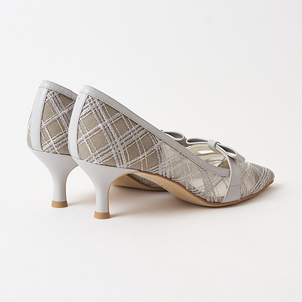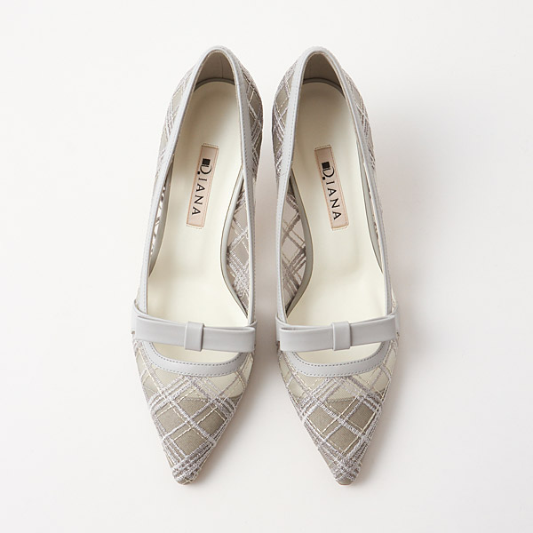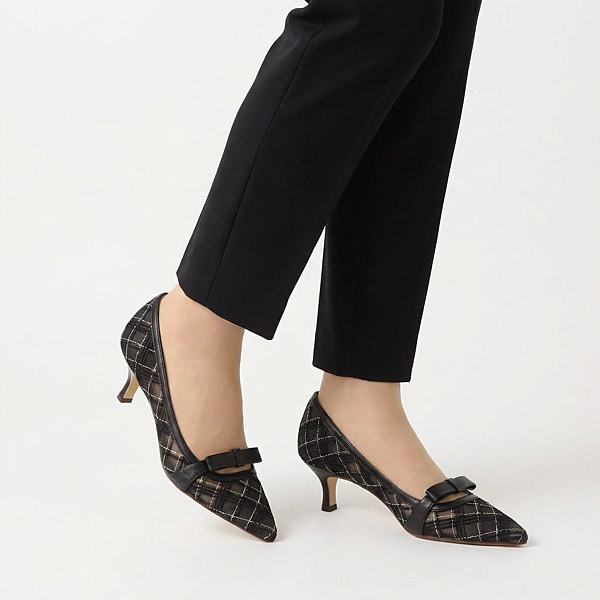 Pumps with an originally designed fabric that is Diana's reinterpretation of a traditional British-style checkered pattern. The topline with a layered bow shows a subtle glimpse of skin, creating a look that isn't too cutesy and looks great on mature women as well!