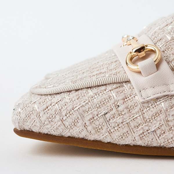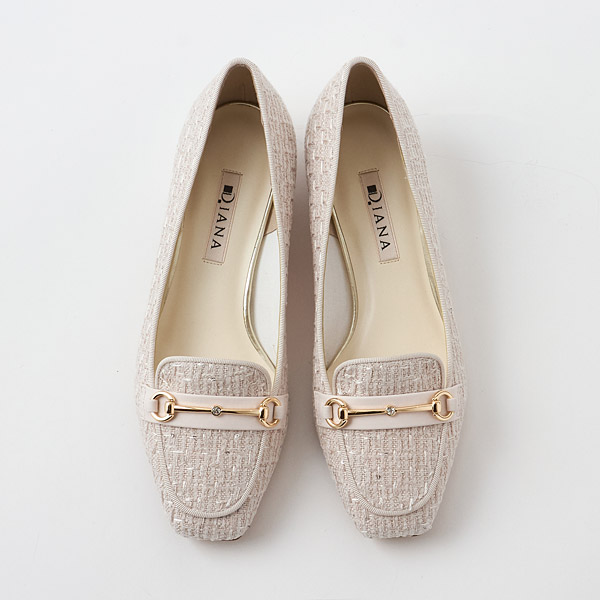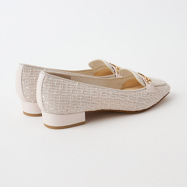 Loafers with bit details highlighting a single sparkling rhinestone. The design that features a slender square toe silhouette and low vamps is great to wear like pumps. A single small rhinestone decorating the center of the bit detail exudes a delicate shine.