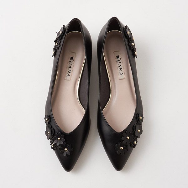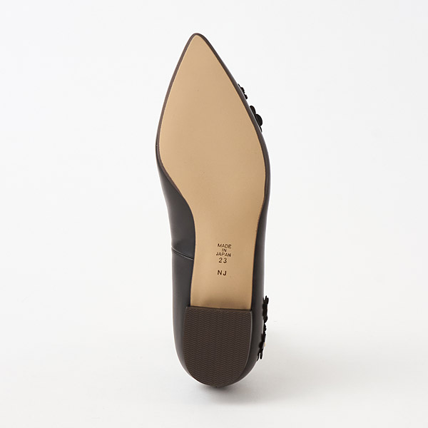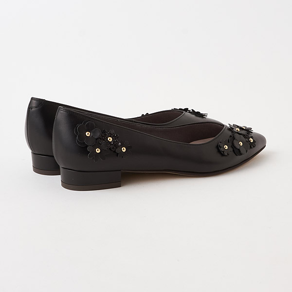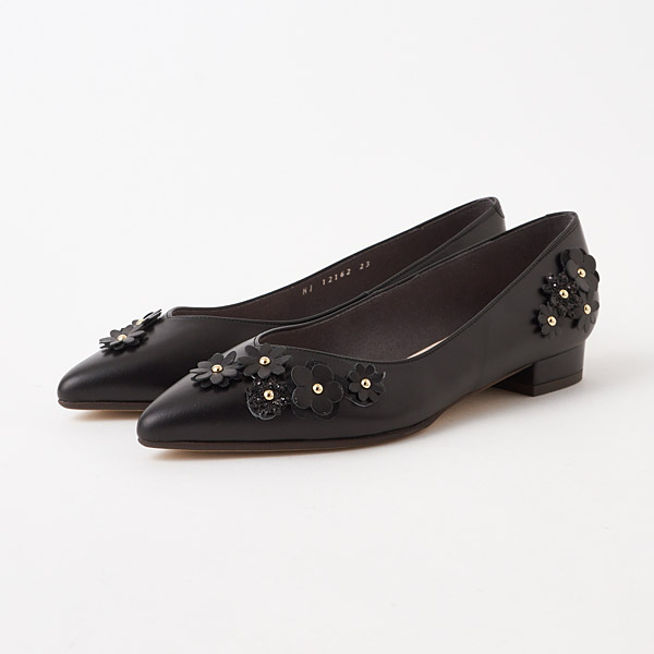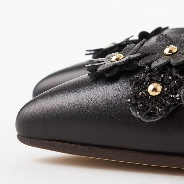 Feminine flats adorned with flower motifs. Shimmery glitter flowers and hardware details add chic glamor to your feet. Asymmetrically placed motifs on the slender pointed toe box create a sophisticated look that is not too cutesy.