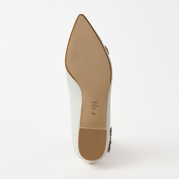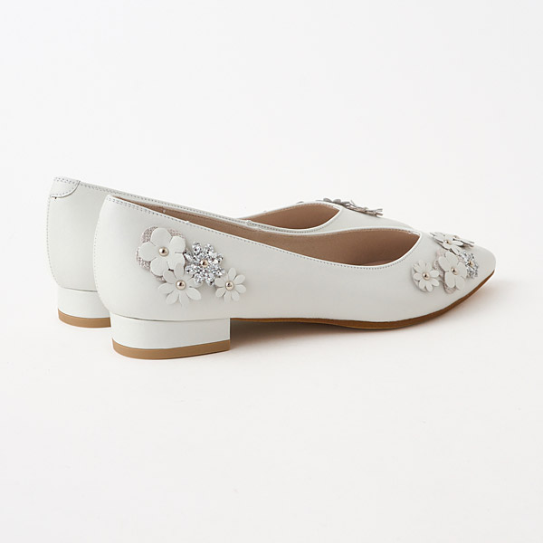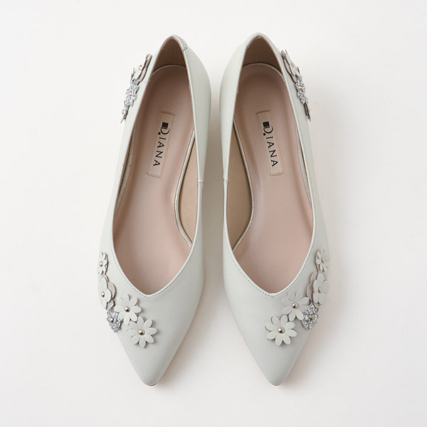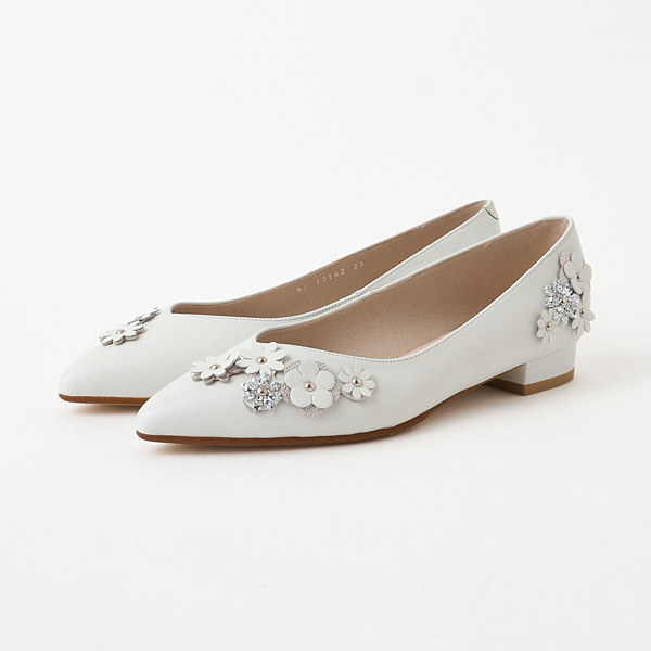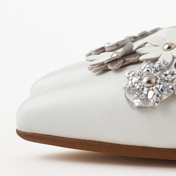 Feminine flats adorned with flower motifs. Shimmery glitter flowers and hardware details add chic glamor to your feet. Asymmetrically placed motifs on the slender pointed toe box create a sophisticated look that is not too cutesy.