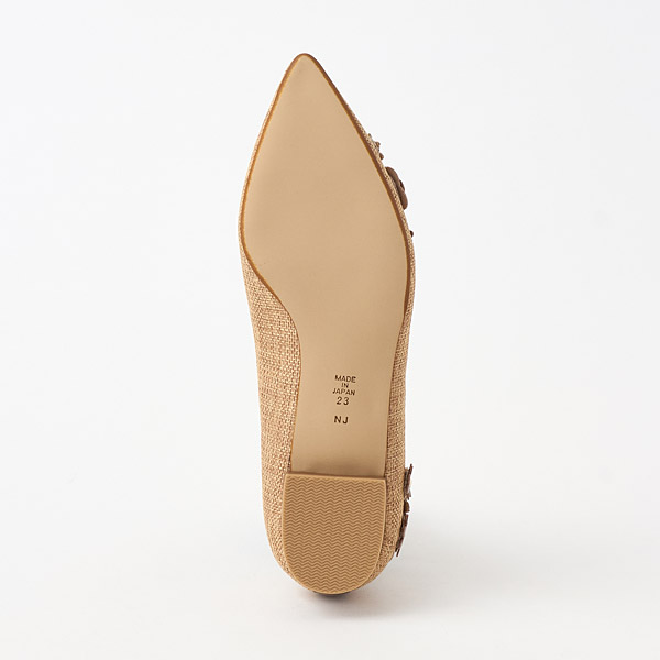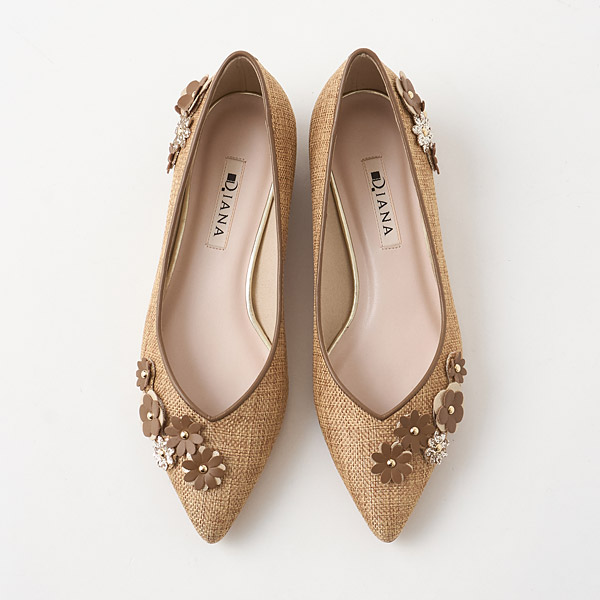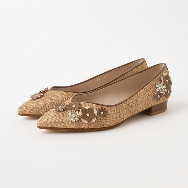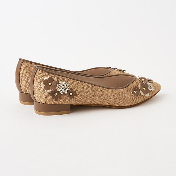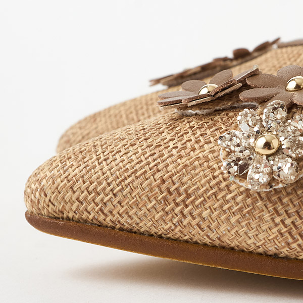 Feminine flats adorned with flower motifs. Shimmery glitter flowers and hardware details add chic glamor to your feet. Asymmetrically placed motifs on the slender pointed toe box create a sophisticated look that is not too cutesy.