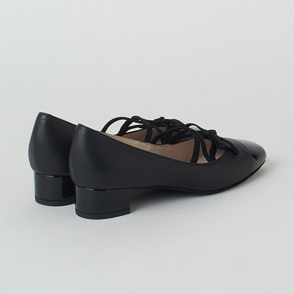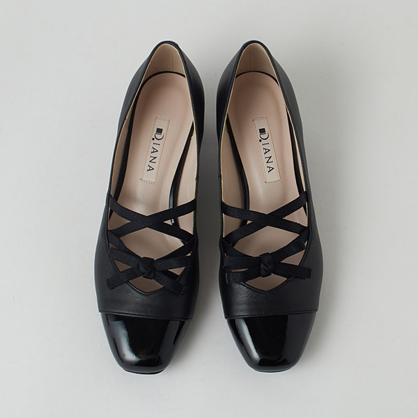 Low heel pumps with criss-crossing ribbons on the instep to create a balletcore vibe. The bow is positioned on the ribbon in a way that is flattering to your instep and reduces skin exposure, creating an elegant look. The rounded square toe box and stable chunky heels provide both walking ease and a cute look.