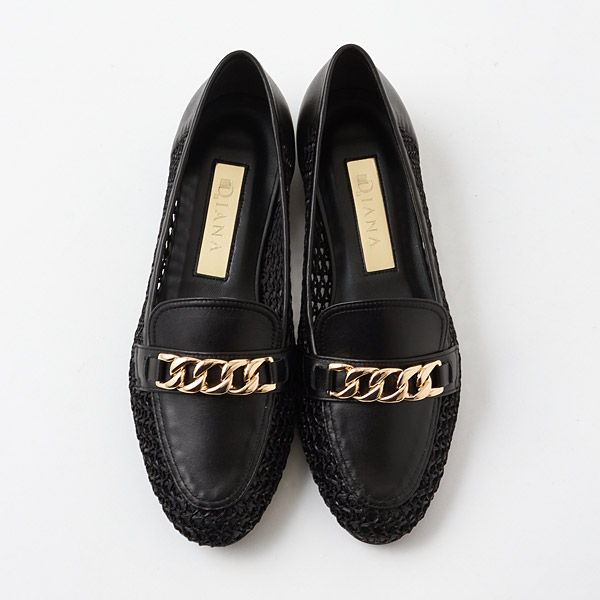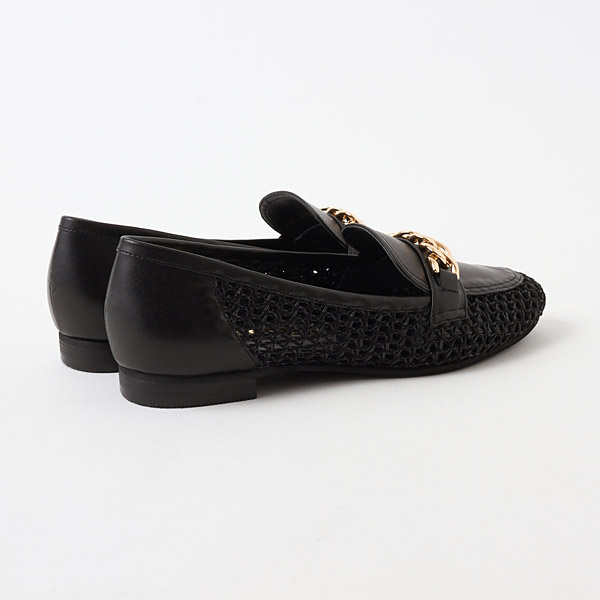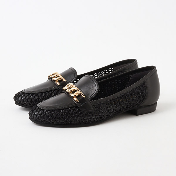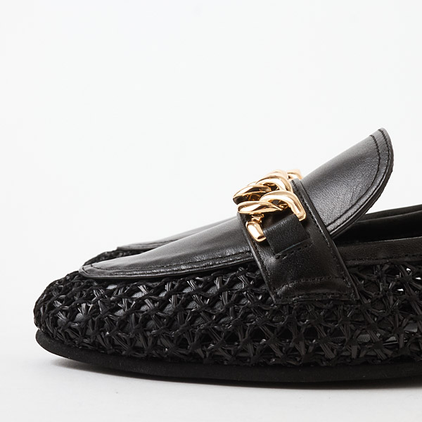 A traditional loafer design is paired with refreshing raffia-style material to update this model with a seasonal vibe. Large shiny gold chains on the uppers provide a rich urban accent for the casual vibe with airy appeal.