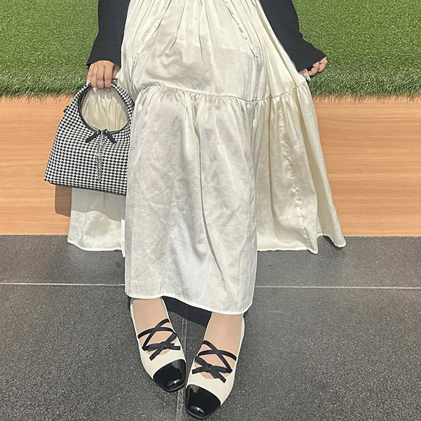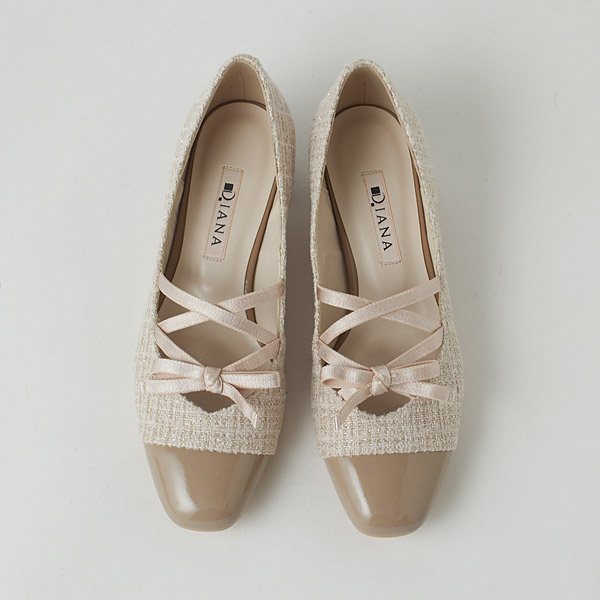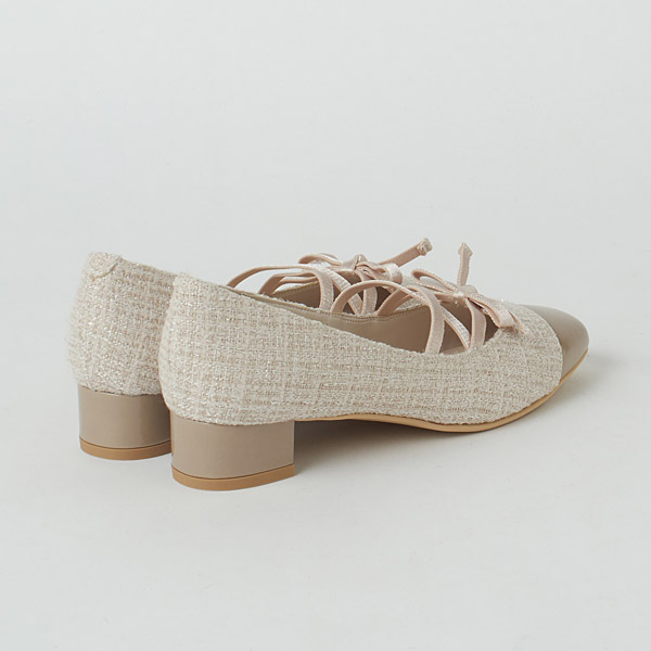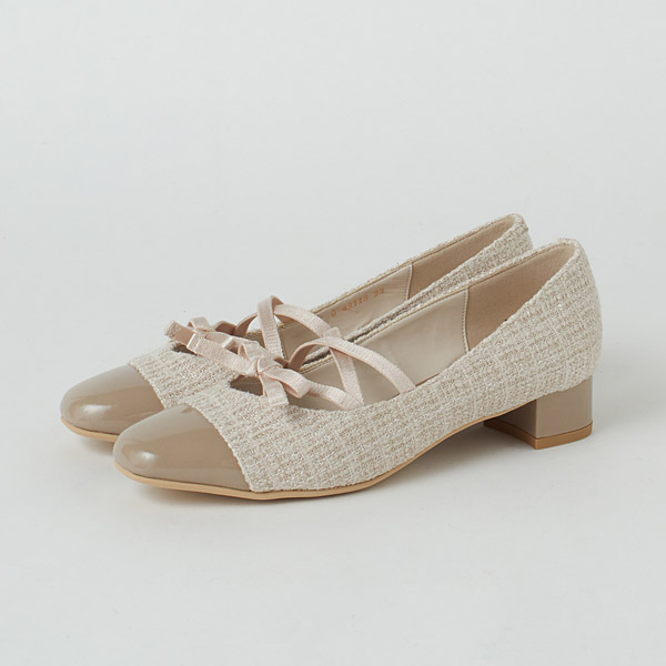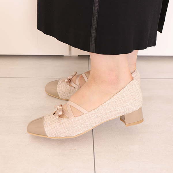 Low heel pumps with criss-crossing ribbons on the instep to create a balletcore vibe. The bow is positioned on the ribbon in a way that is flattering to your instep and reduces skin exposure, creating an elegant look. The rounded square toe box and stable chunky heels provide both walking ease and a cute look.