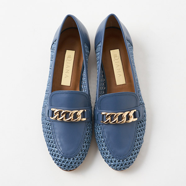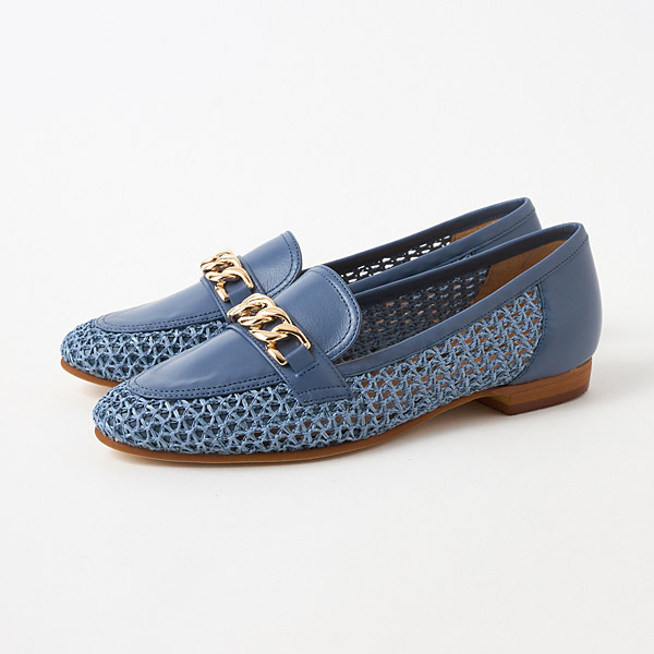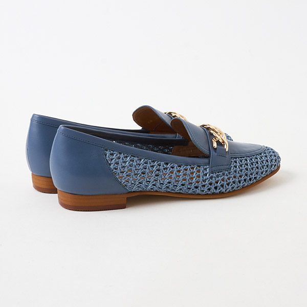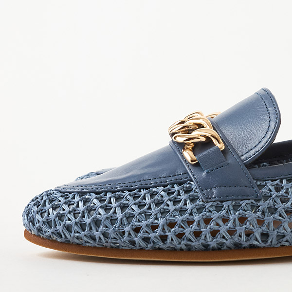 A traditional loafer design is paired with refreshing raffia-style material to update this model with a seasonal vibe. Large shiny gold chains on the uppers provide a rich urban accent for the casual vibe with airy appeal.
