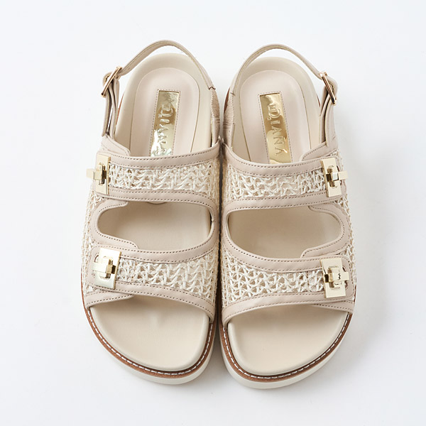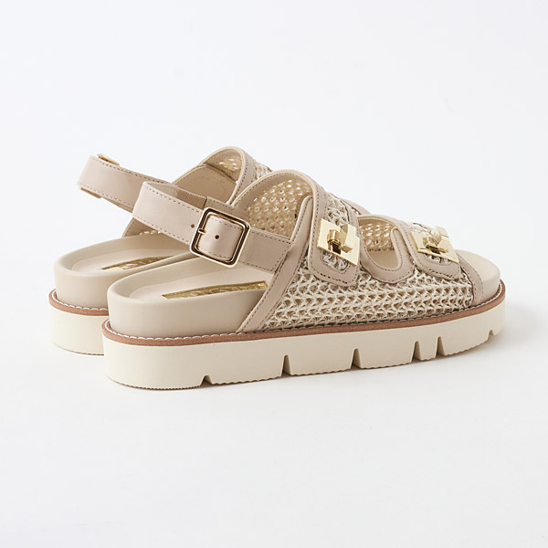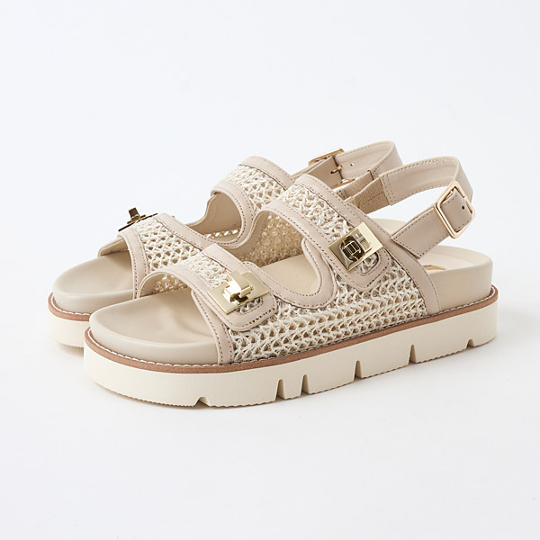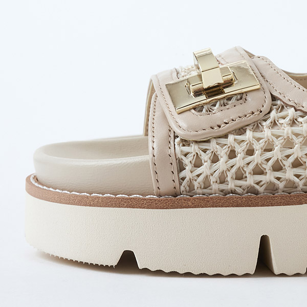 Made with raffia-style material, these offer both an earthy airy appeal and a dignified mode vibe. The turn lock hardware detail that exudes class adds a refined touch of glamor to your feet. Voluminous soles that are just thick enough make walking a breeze while boosting your style.