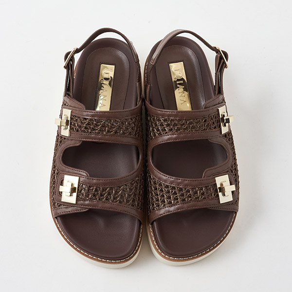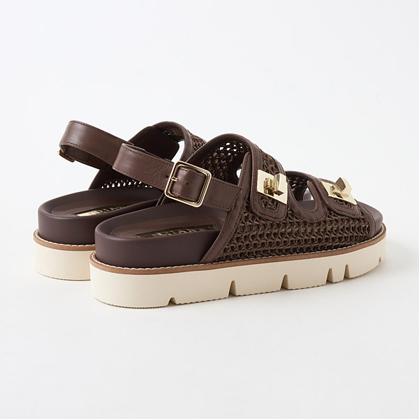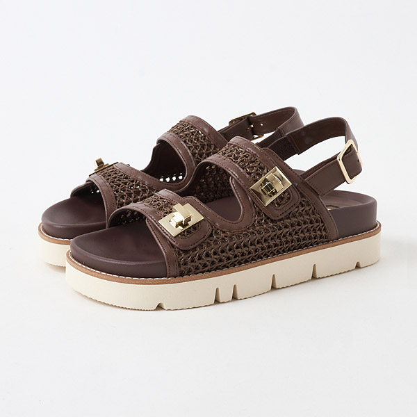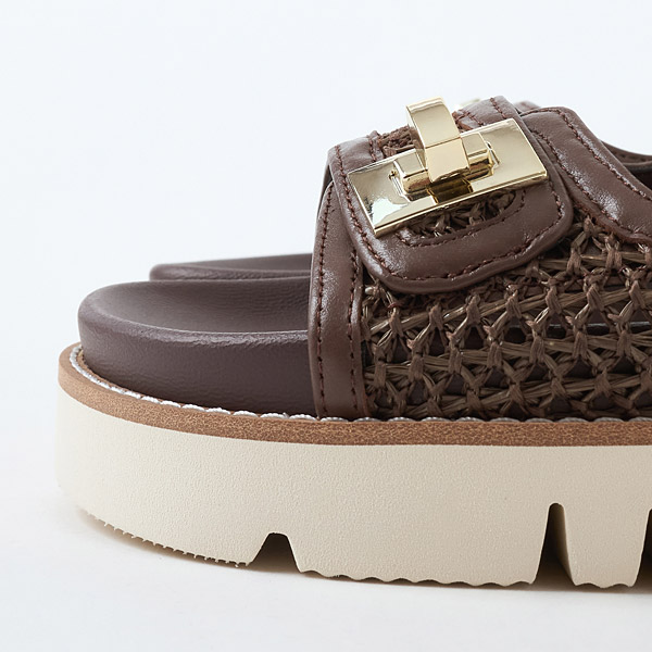 Made with raffia-style material, these offer both an earthy airy appeal and a dignified mode vibe. The turn lock hardware detail that exudes class adds a refined touch of glamor to your feet. Voluminous soles that are just thick enough make walking a breeze while boosting your style.