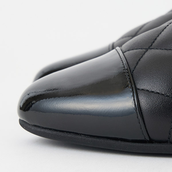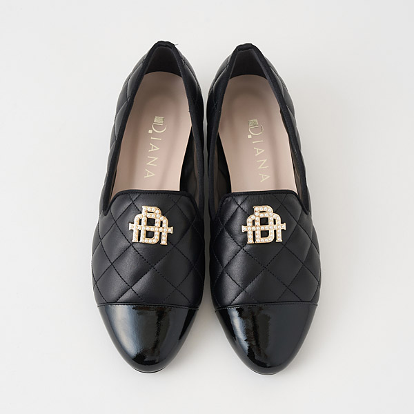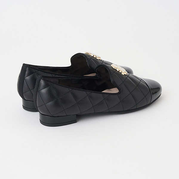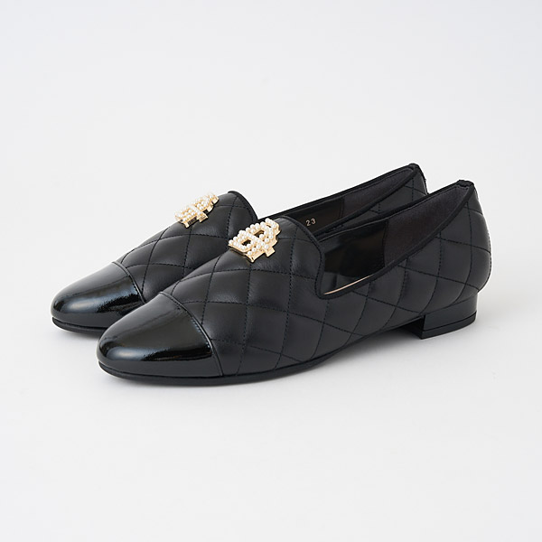 Feminine opera slippers in puffy and elegant quilted smooth leather with toe cap accents. The uppers feature an originally designed metal monogram detail embellished with shimmery pearls to add glamor to your feet.