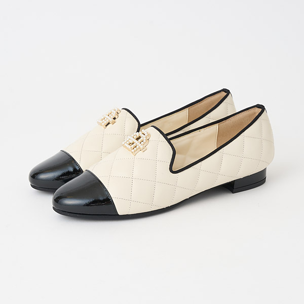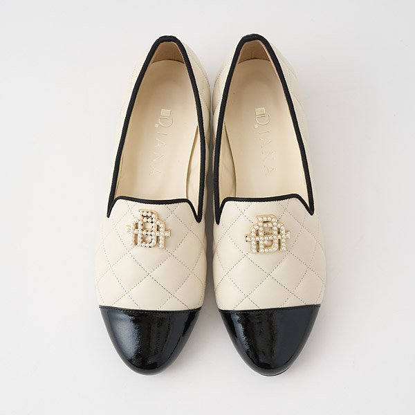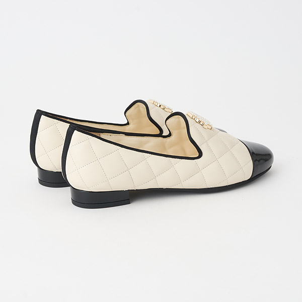 Feminine opera slippers in puffy and elegant quilted smooth leather with toe cap accents. The uppers feature an originally designed metal monogram detail embellished with shimmery pearls to add glamor to your feet.