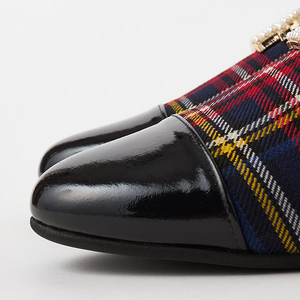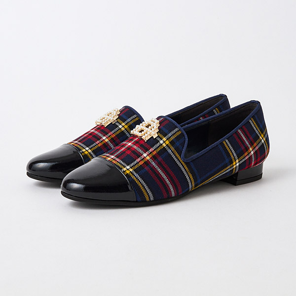 Feminine opera slippers in puffy and elegant quilted smooth leather with toe cap accents. The uppers feature an originally designed metal monogram detail embellished with shimmery pearls to add glamor to your feet.