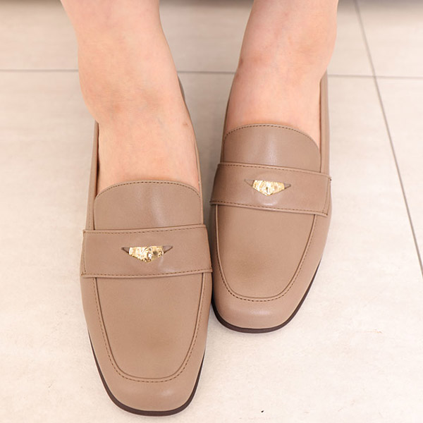 High heeled loafers featuring a high quality leather texture and a slender soft square toe box. A subtly shining gold coin in the middle adds a posh touch.