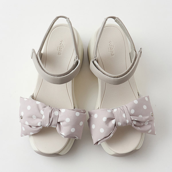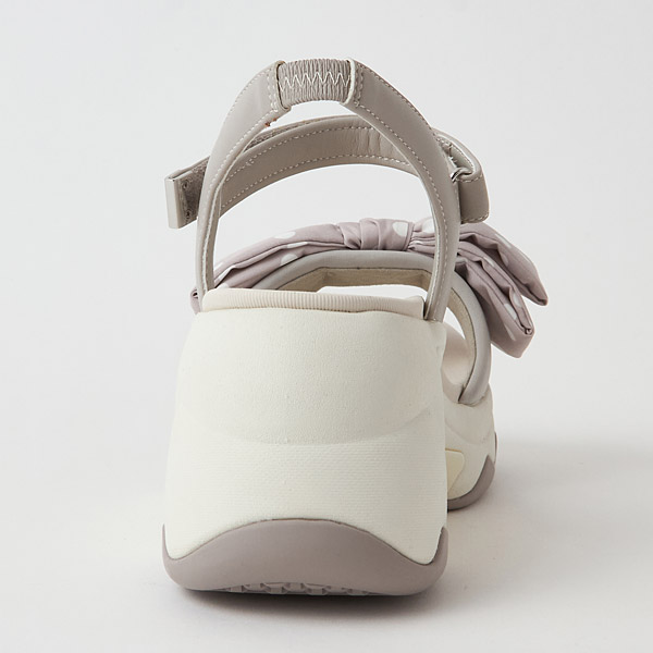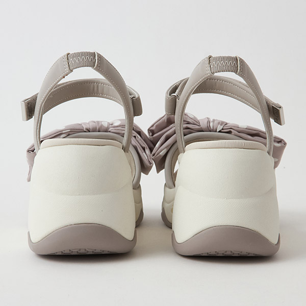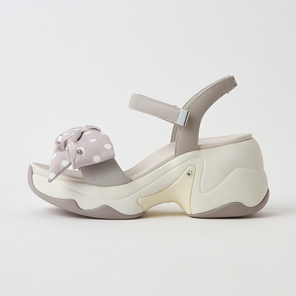 High heel sports sandals that combine voluminous soles with large bows and dainty ankle straps. The well-defined balance makes your legs look dainty. The asymmetrical bows are subtly embellished with a single rhinestone. The striking feminine design makes a great accent with pants too. Key points are the sturdy comfort of the soles that are about 8 cm but reduced to about 5 cm with the gradient and the puffy footbed.