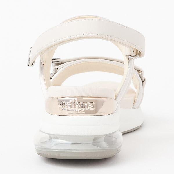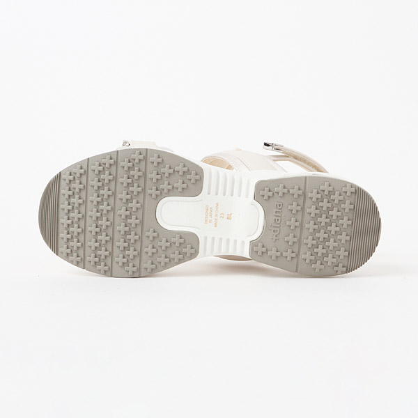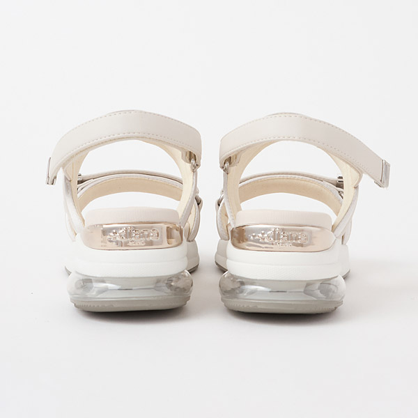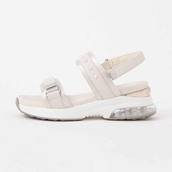 Sports sandals with air cushion soles that create a light look with airy appeal. The straps that add depth by layering satin and smooth artificial leather are decorated with pyramid-shaped studs to create a subtle edgy tone. The studs are painted the same color as the uppers to provide just the right accent without looking too cool.