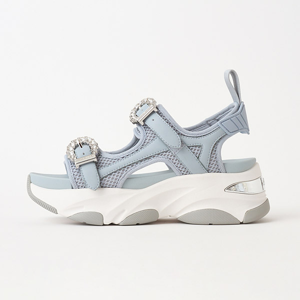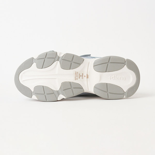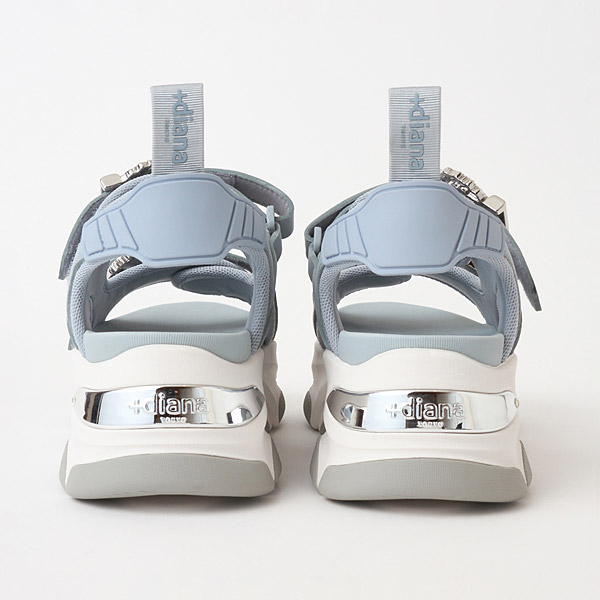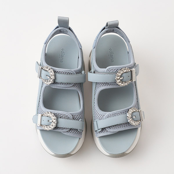 Sports sandals with two originally-designed rhinestone-adorned buckles. Smooth straps over mesh uppers and a TPU part on the heel counter add just the right sporty mood. The casual design is embellished with a distinctive +diana balance that highlights the shoes' shimmery glamor.
