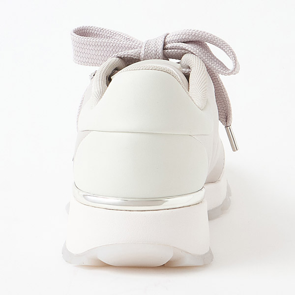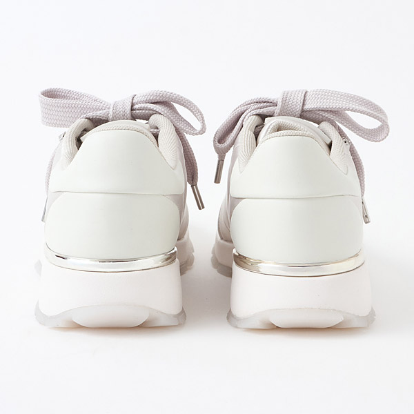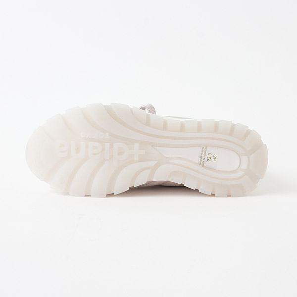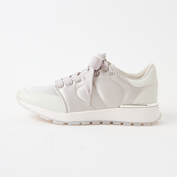 Simple sneakers made of eye-catching lustrous satin. The satin body stitched in a puffy design is paired with semi-transparent rubber soles to create a light and feminine look.