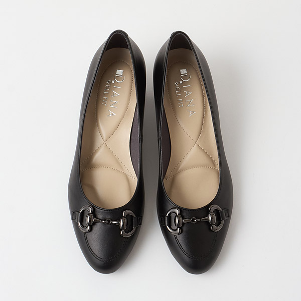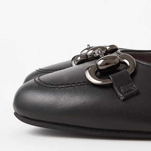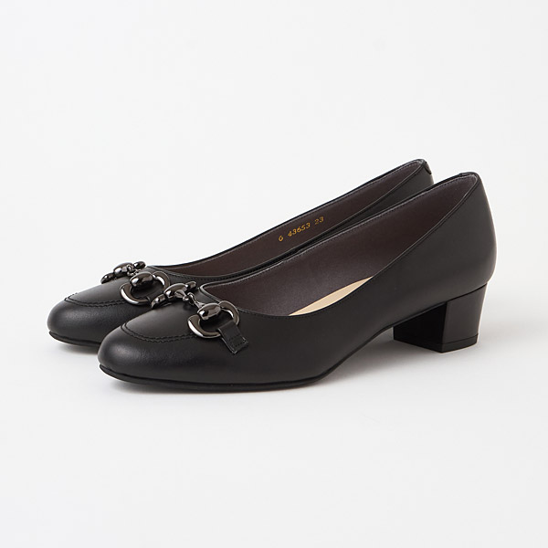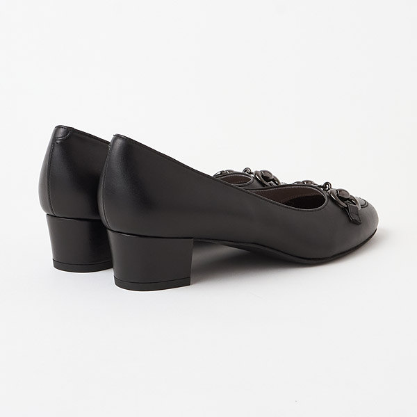 Low heel pumps with eye-catching bit details decorating gentle round toes.