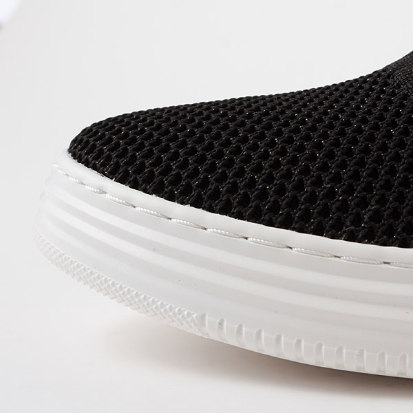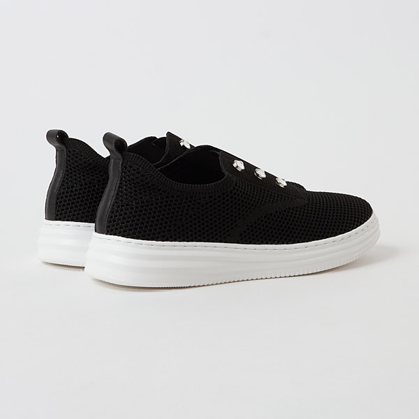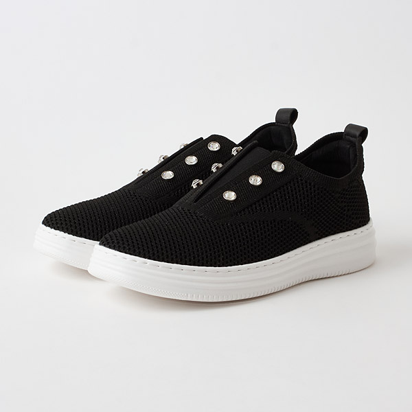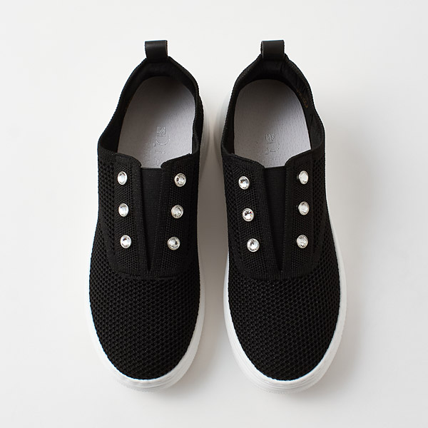 Stretch knit slipons with eye-catching rhinestones on the instep. A great point is that they are not overly casual and keep you looking fresh and elegant.