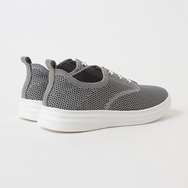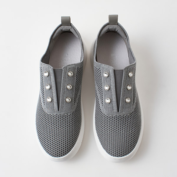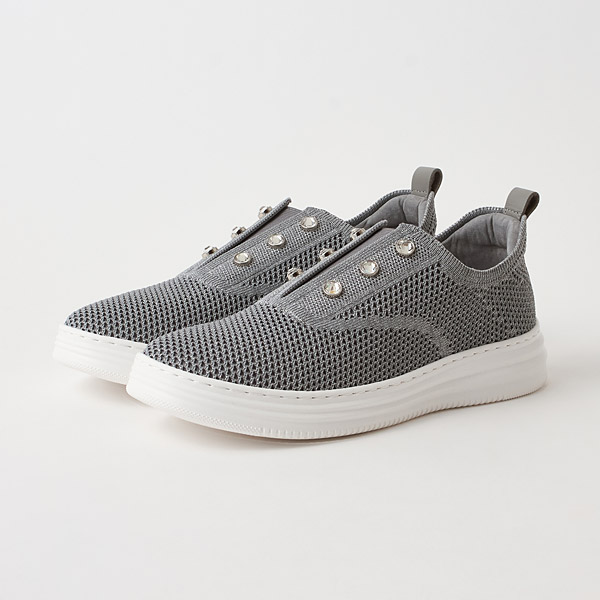 Stretch knit slipons with eye-catching rhinestones on the instep. A great point is that they are not overly casual and keep you looking fresh and elegant.