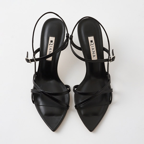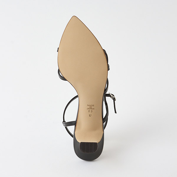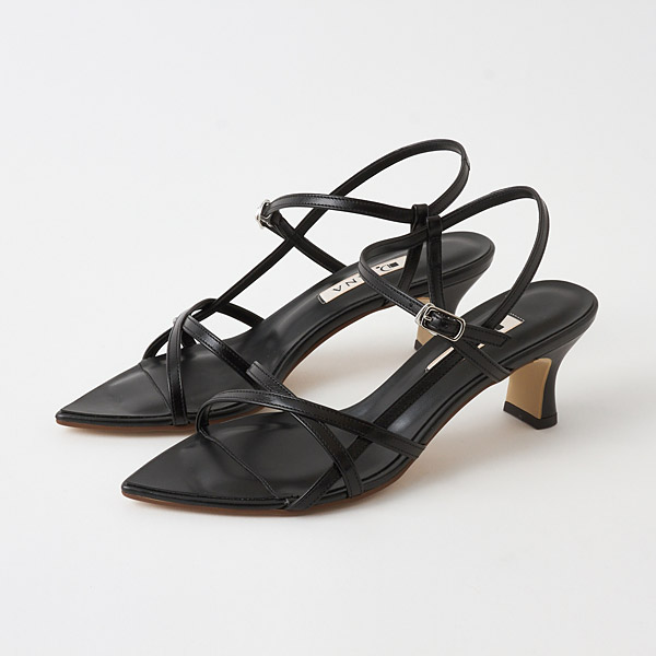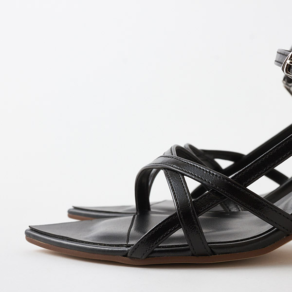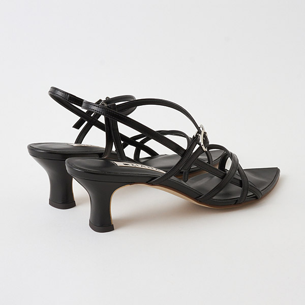 A delicate string sandal designed with multiple fine straps that create an architectural look across the instep. Each strap is refined to the thinnest possible line, and their overlapping layers form a beautifully balanced silhouette. The elegantly curved flare heel adds a feminine accent.