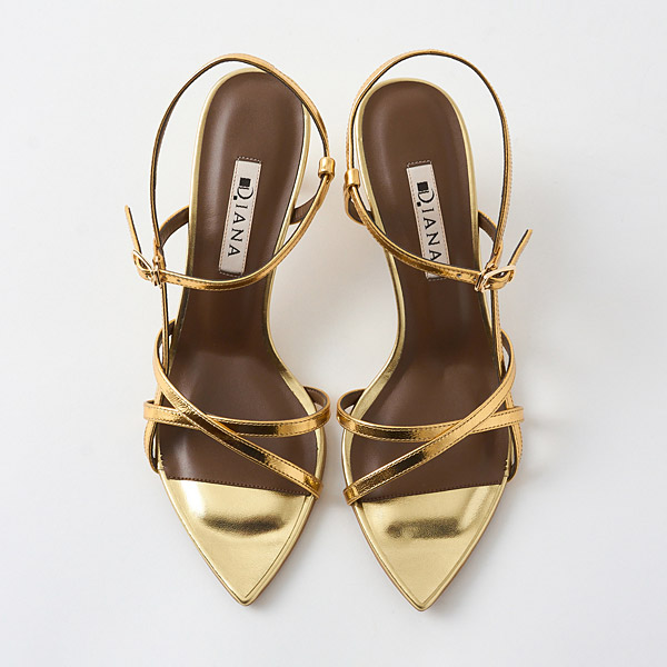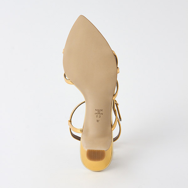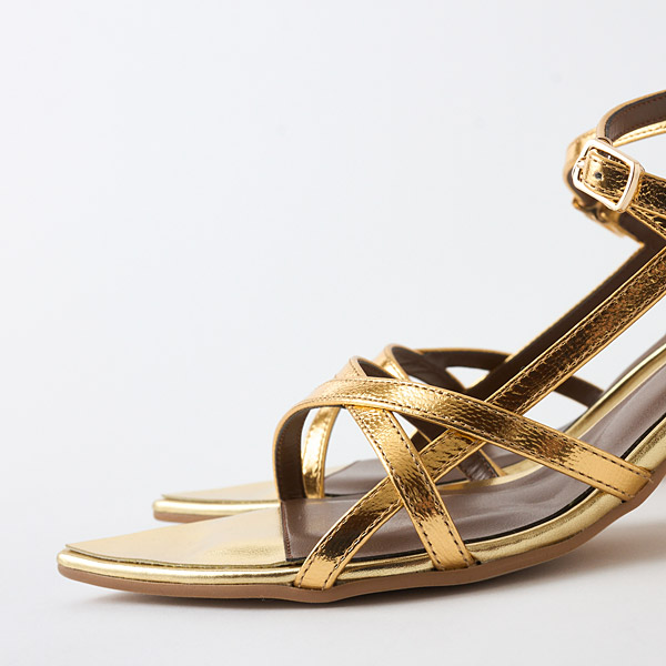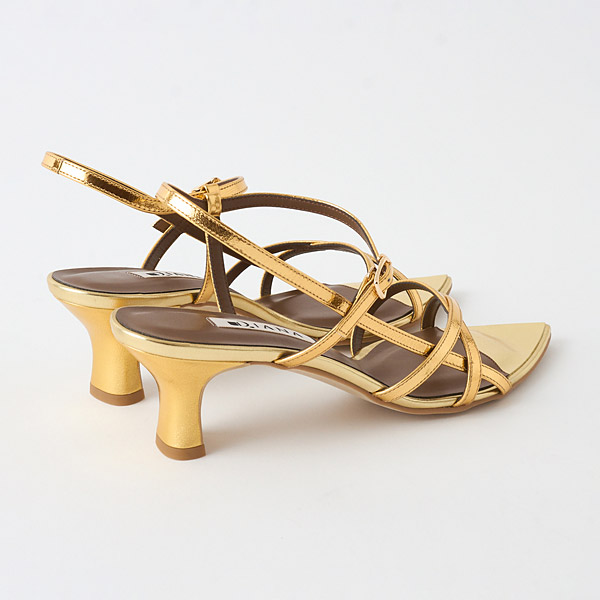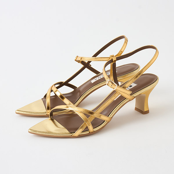 A delicate string sandal designed with multiple fine straps that create an architectural look across the instep. Each strap is refined to the thinnest possible line, and their overlapping layers form a beautifully balanced silhouette. The elegantly curved flare heel adds a feminine accent.