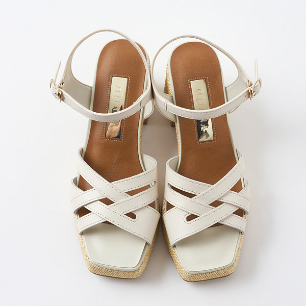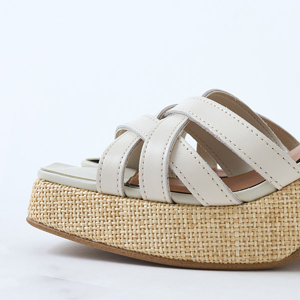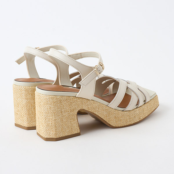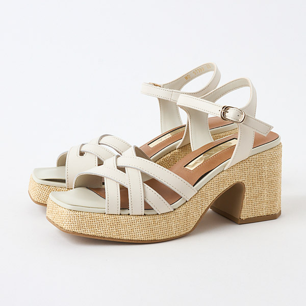 Classic thick-soled sandals from DIANA that are essential for summer. The uppers have an asymmetrical design that combines stability to hold the big toe side of your foot securely in place and thin lines on the pinky toe side. They offer a snug hold while making your feet look slender and stunning with the exquisite airy appeal of well-calculated lines. The raffia-style material around the soles makes a great seasonal accent.
