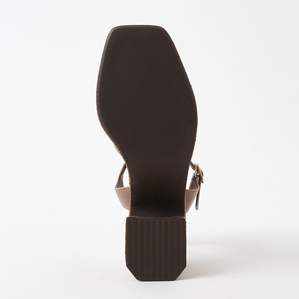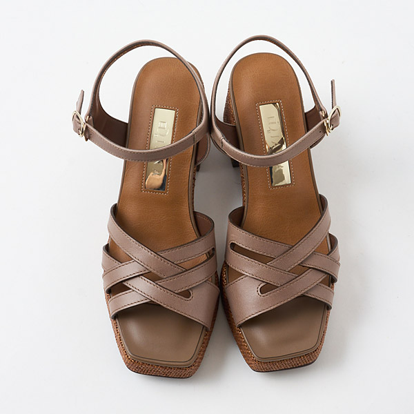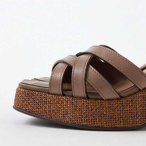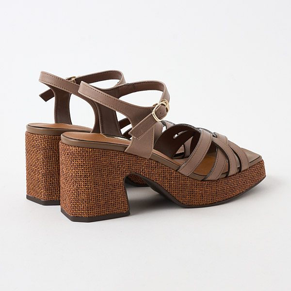Classic thick-soled sandals from DIANA that are essential for summer. The uppers have an asymmetrical design that combines stability to hold the big toe side of your foot securely in place and thin lines on the pinky toe side. They offer a snug hold while making your feet look slender and stunning with the exquisite airy appeal of well-calculated lines. The raffia-style material around the soles makes a great seasonal accent.